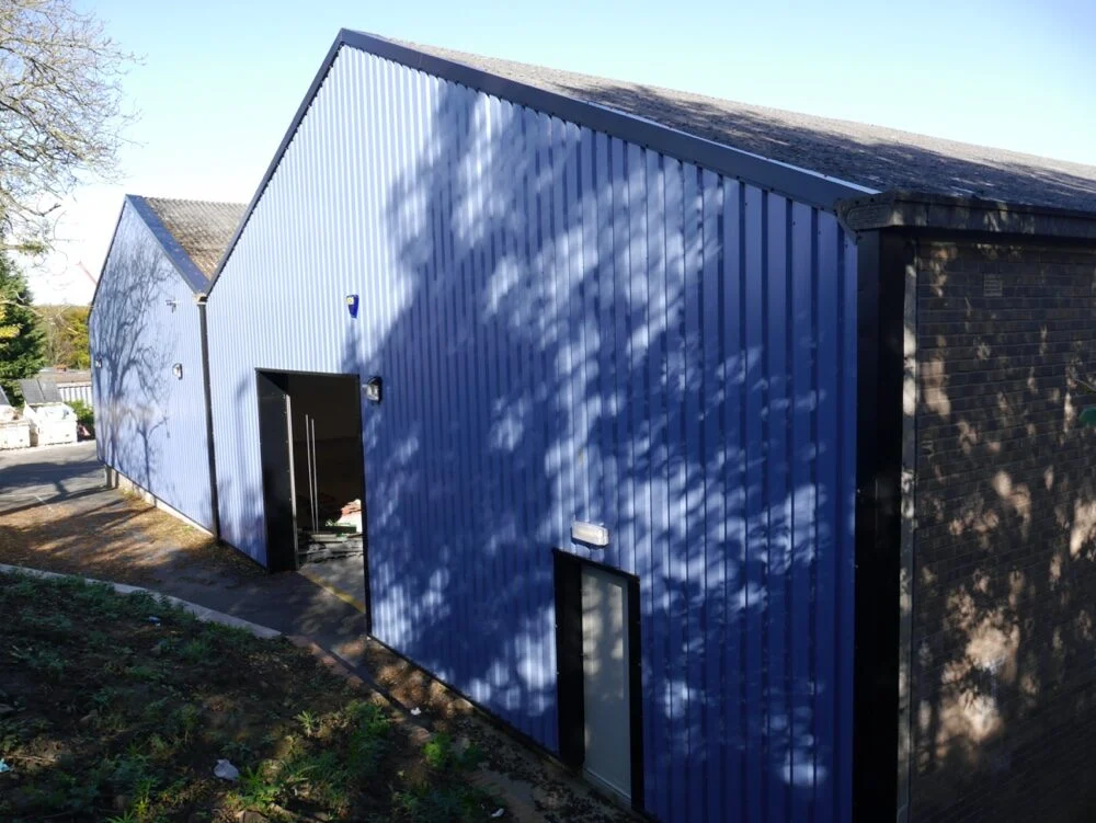 The solution provided for the client to the brick wall area was to overclad the existing brick wall with new 0.7mm plastisol coated steel profiled cladding complete with flashings around all the apertures, doorways and windows.